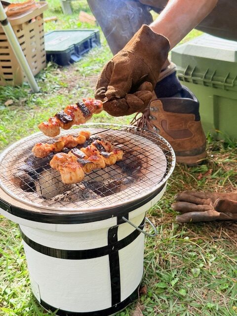 七輪で焼いた焼き鳥が最高で、自然の中で食べるとさらに美味しく感じました♪